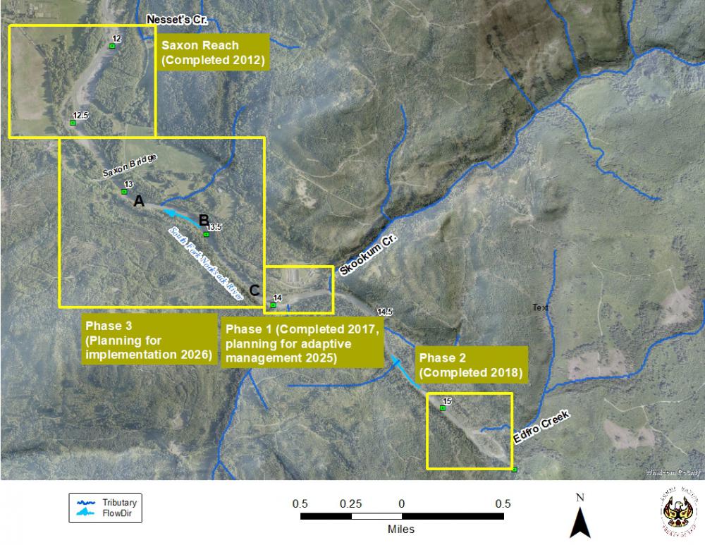 LNR and its engineering team developed designs to adaptively manage the Skookum Edfro Phase 1 Restoration Project to encourage more flow to the Skookum Creek Fish Hatchery outfall. Phase 1 was built in 2017 and this design will work in the same area, between approximately the Skookum Creek confluence (rm 14.3) to around the island (rm 14). Phase 1 Adaptive Management will address the chinook mortality event of 2021, along with additional mortality events in each year since. The hatchery outlet channel is where Lummi hatchery brood stock chinook returns to spawn, and is located in the right (north) side channel next to 'Skookum Island'. The side channel contains too low of flow when adult chinook return in August through early October. Three engineered log structures (ELSs) will be installed in the river channel to create holding pools for adult salmonids. Habitat structures will be placed in the hatchery channel. An emergency vault will be built in the hatchery channel in the existing hatchery channel. The project is out to bid now, with bids due on June 10th, 2025. The bid-level design is attached.