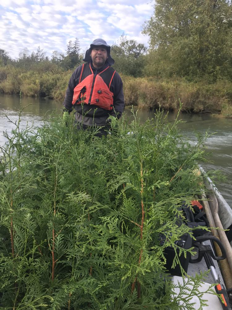 Lummi youth planting trees along the Nooksack for salmon habitat.